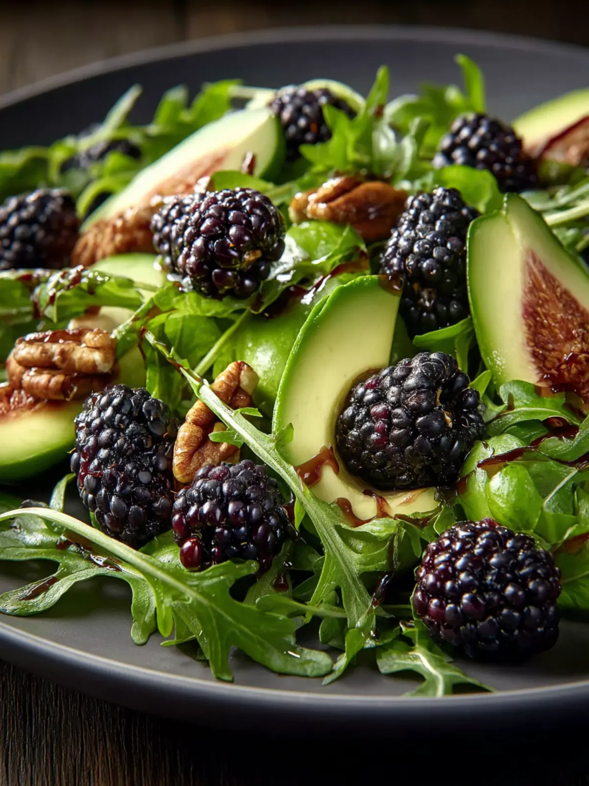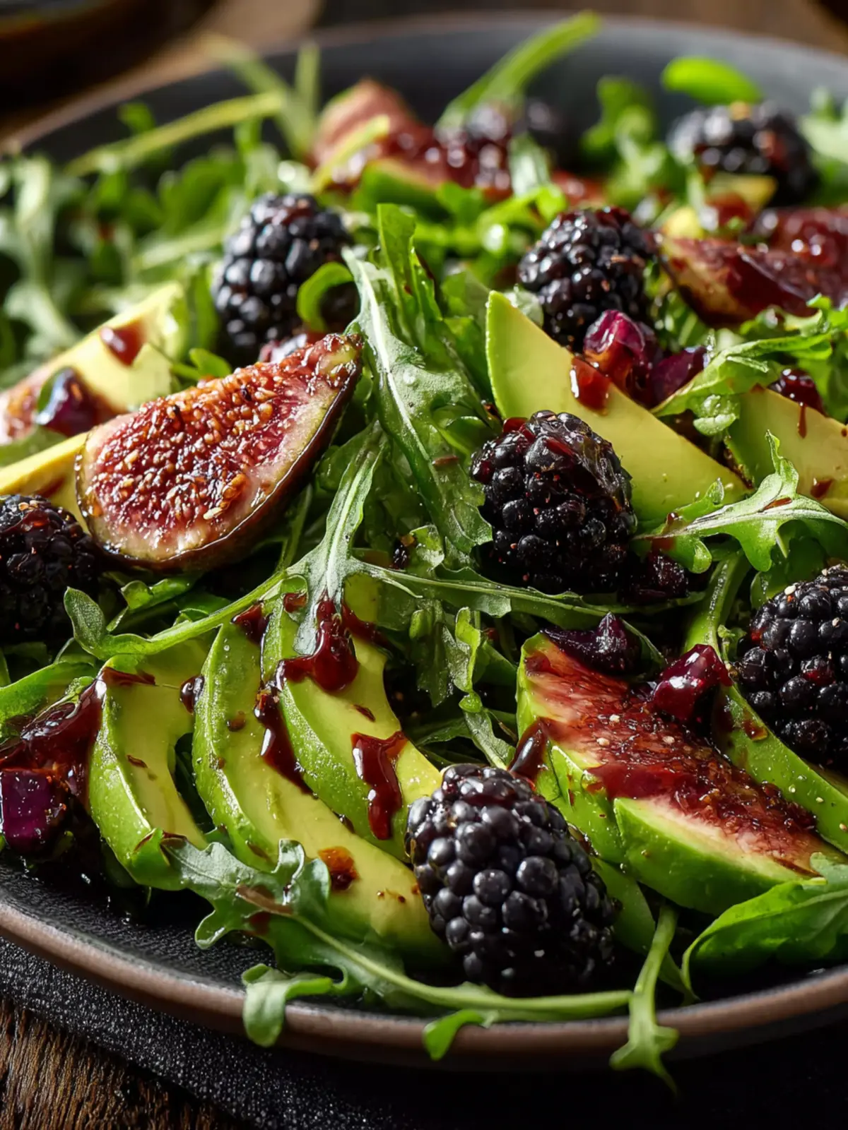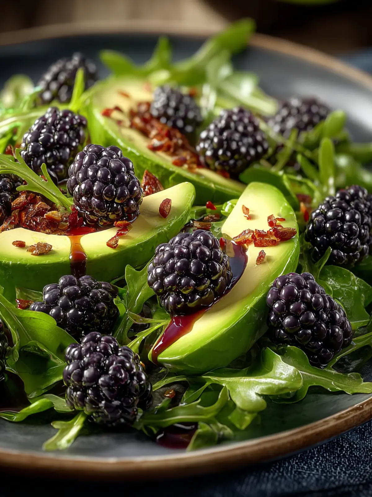 A refreshing salad featuring arugula, blackberries, and avocado, dressed with a light balsamic vinaigrette.
