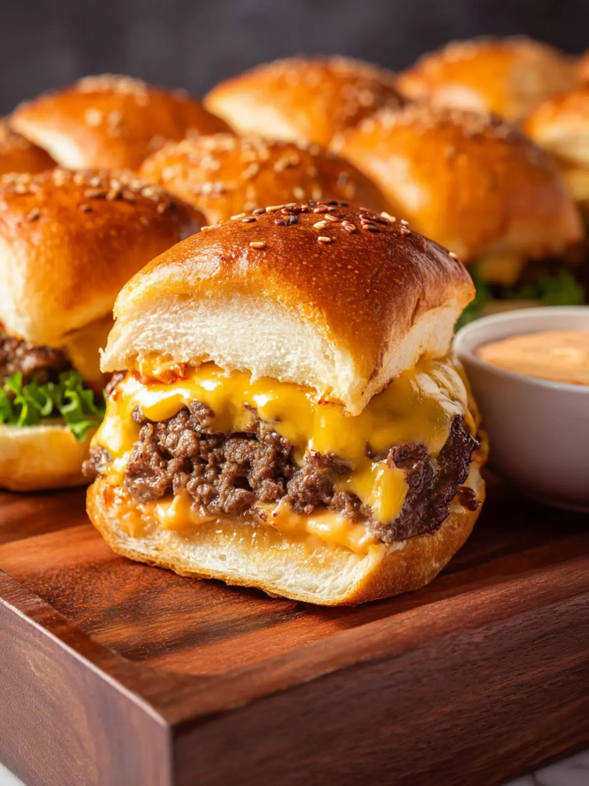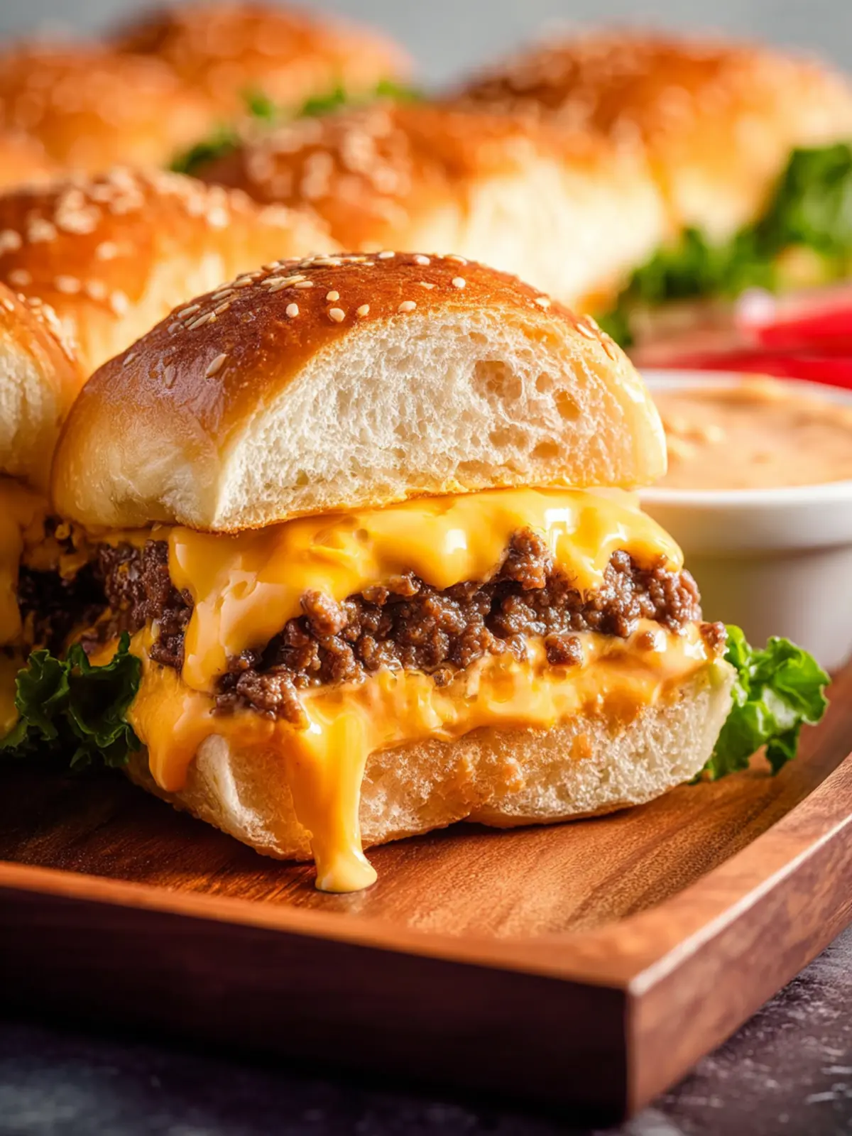 Delicious ground beef sliders topped with American cheese and a special sauce, perfect for gatherings.