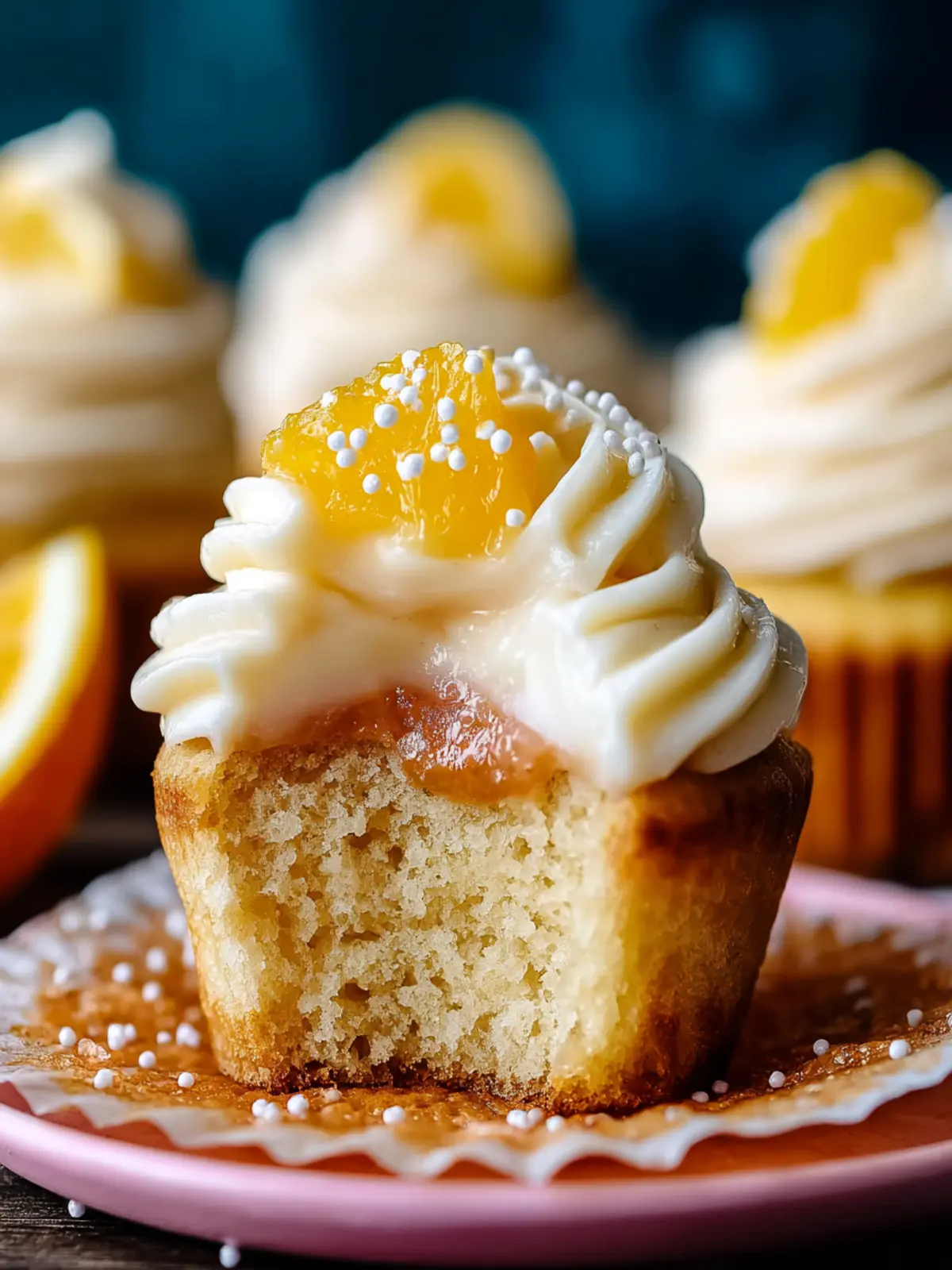 Delicious orange-flavored cupcakes topped with a light whipped frosting.