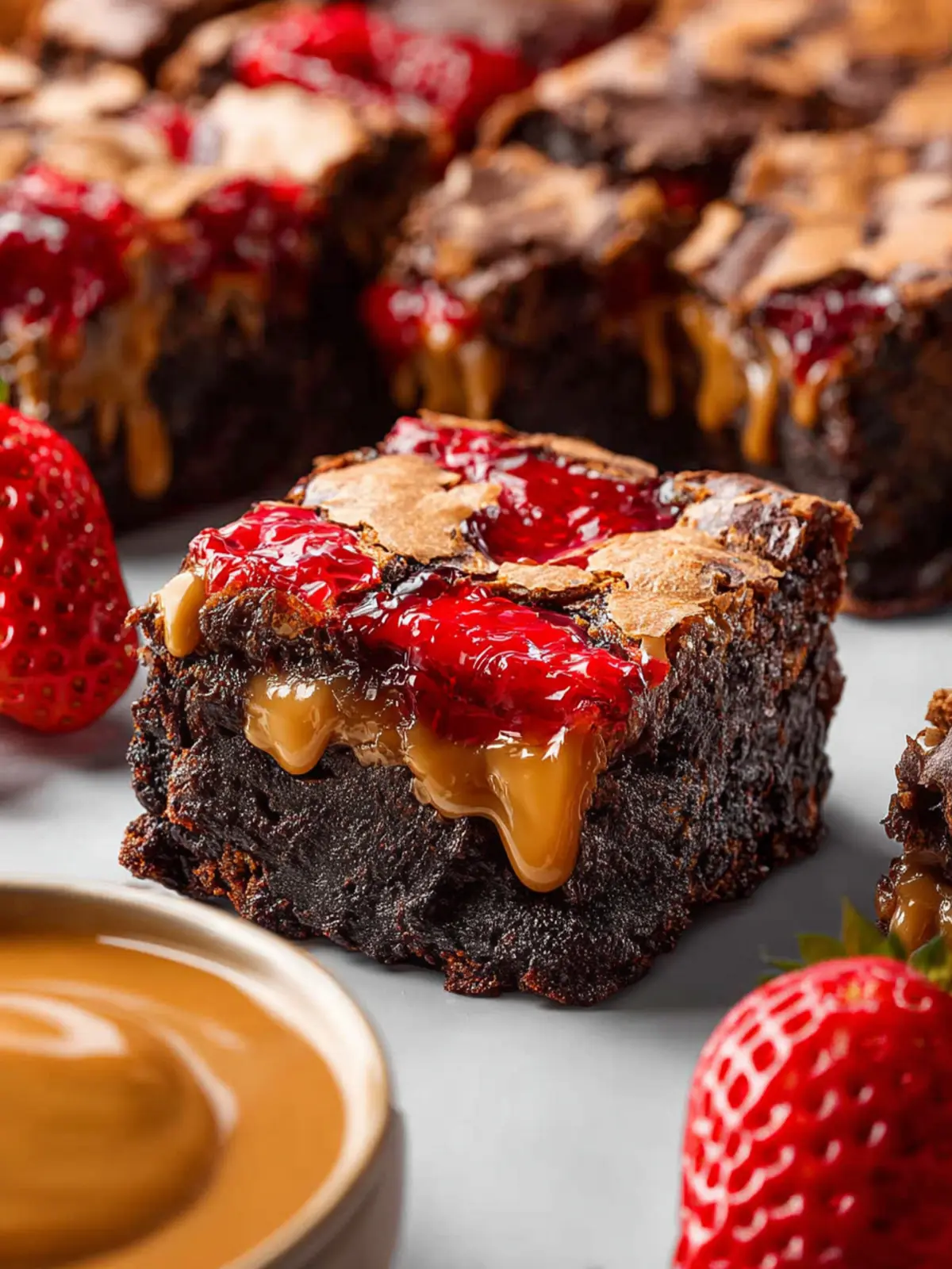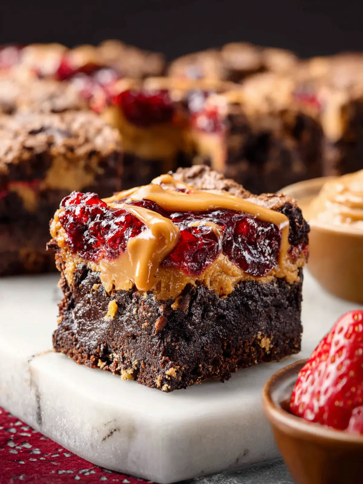 Texture Contrast: The fudgy brownie base offers a rich, decadent bite, while the peanut butter provides a smooth, creamy layer, and jelly adds a slight fruitiness, creating a multi-textured experience with every mouthful.