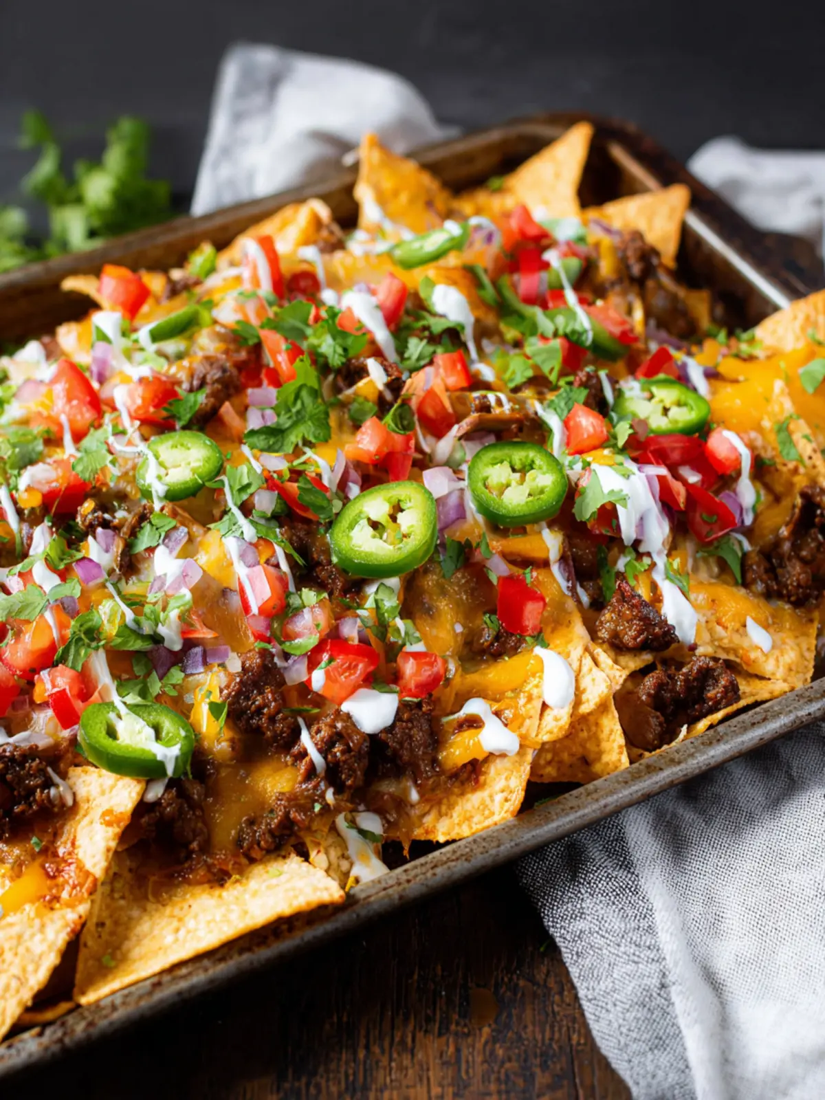 Toppings: To round out your sheet pan beef nachos, load them up with diced tomatoes, jalapeños, and sliced olives. Fresh cilantro sprinkled on top adds a burst of flavor that’s both aromatic and delicious, making every bite an adventure.