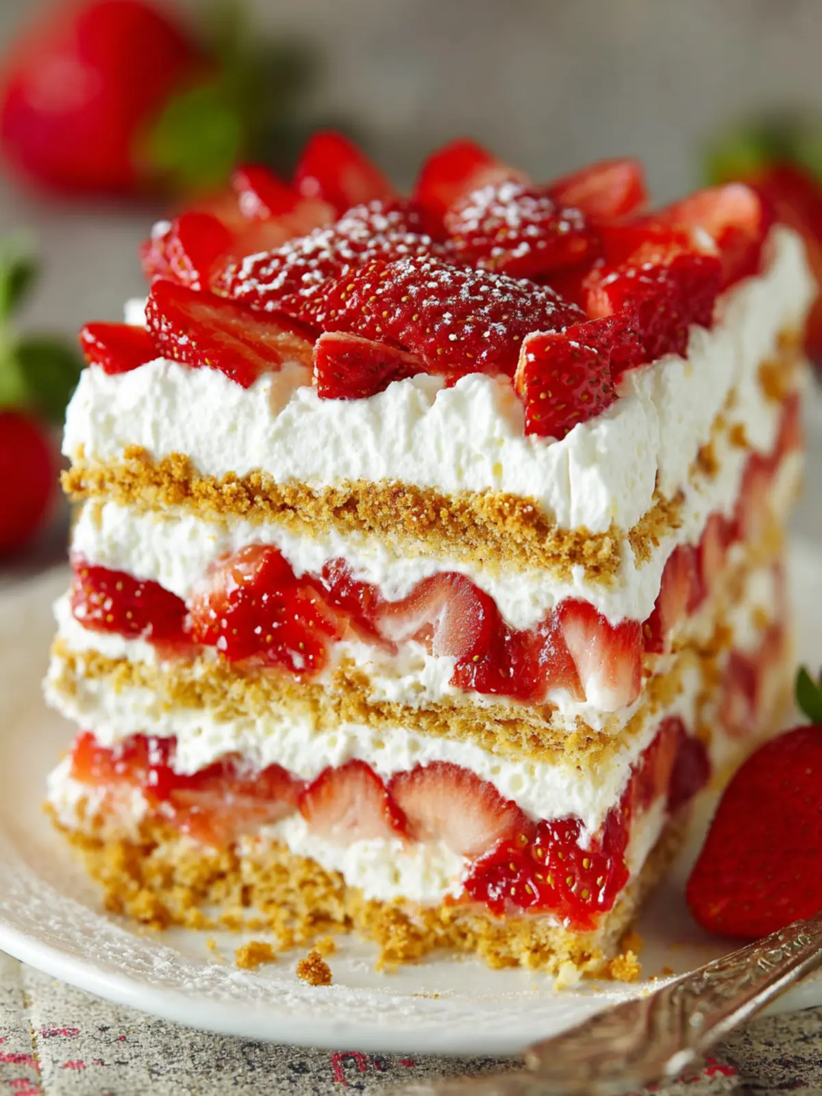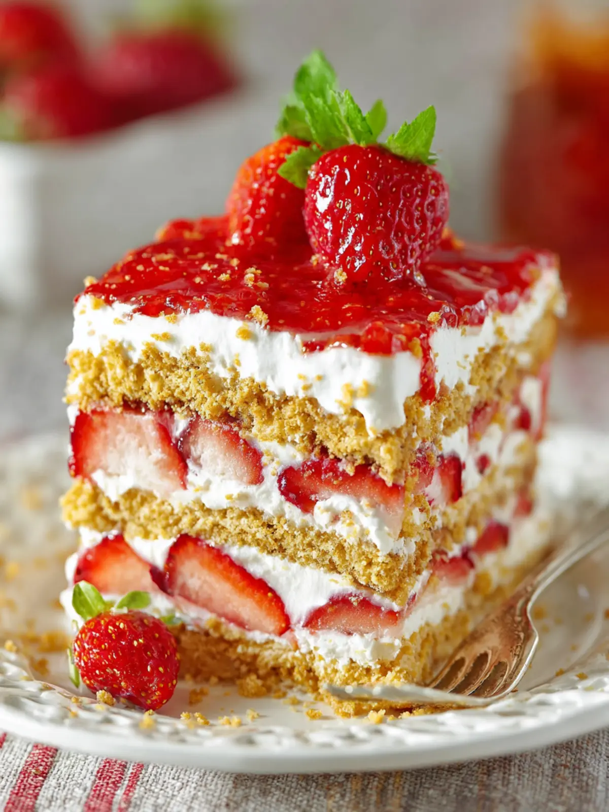 A refreshing strawberry dessert layered with whipped cream and graham crackers.